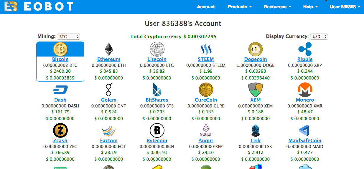 Eobot — это сервис облачного майнинга, который поддерживает майнинг для алгоритмов SHA256 и Scrypt и в настоящее время поддерживает облачный майнинг 21 различных криптовалют, включая BTC, ETH, LTC, STEEM, DOGE, XRP, DASH, RDD, BTS, CURE, XEM, XMR. , ZEC, FCT, BCN, REP, LSK, MAID и GRC.Он также имеет обмен криптовалютой в реальном времени, который позволяет пользователям обмениваться любой поддерживаемой криптовалютой между собой.