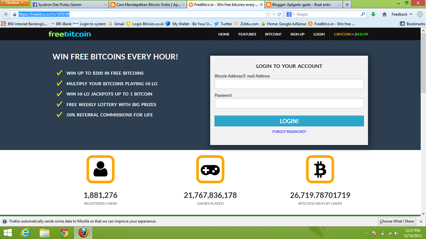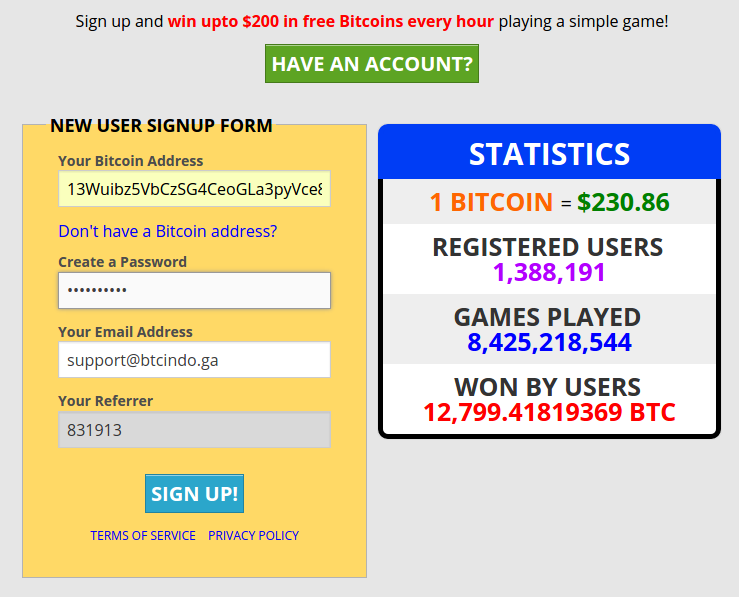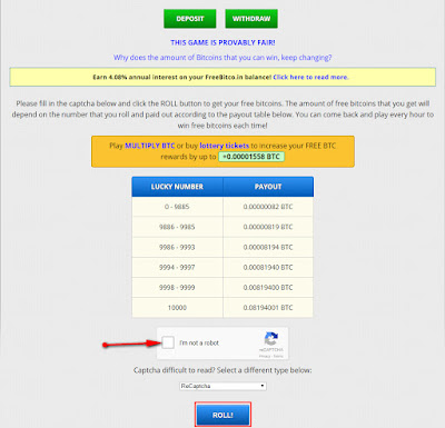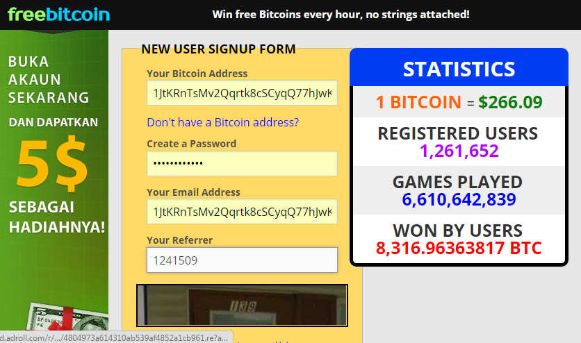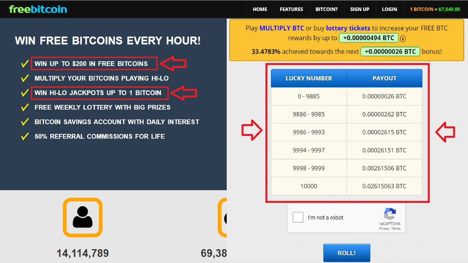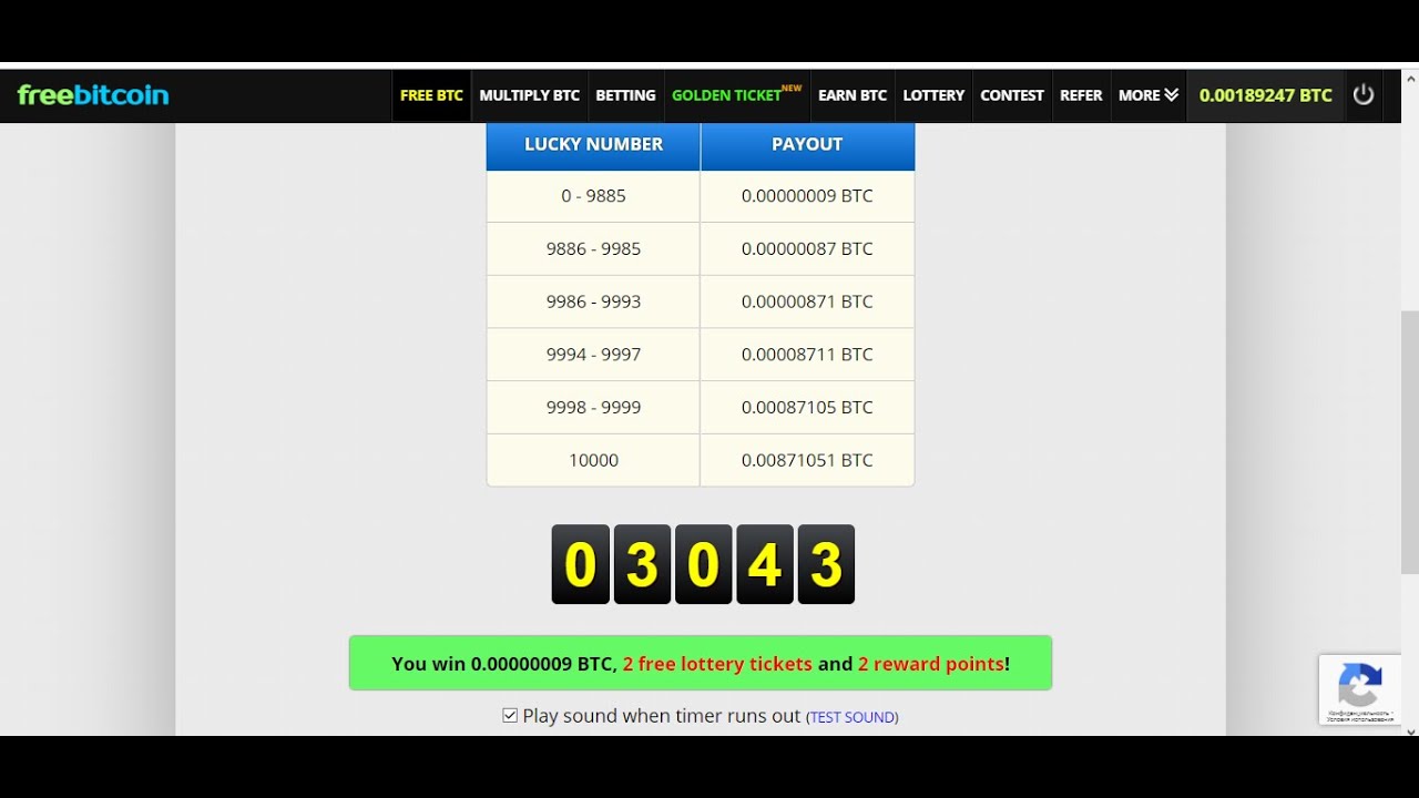 Ежечасно зарегистрированные посетители FreeBitcoin имеют возможность получить бесплатные BTC за ввод капчи. В такой лотерее можно «заработать» от 0,00000037 до 0,037 BTC.