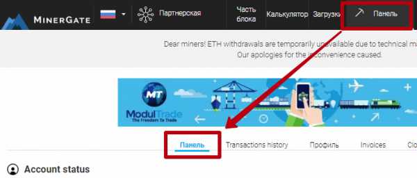 Но вернемся на платформу. После авторизации или регистрации попадаем в админку MinerGate. В верхнем меню переходим в раздел «Панель».