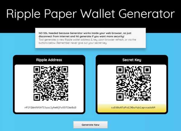 Создается бумажный кошелек с помощью специальных сервисов, например, ripplepaperwallet.com. Здесь вы генерируете адрес и секретный ключ и распечатываете их. Делать это стоит, отключив интернет. Позднее, когда средства необходимо будет использовать, их можно импортировать в один из описанных выше кошельков.