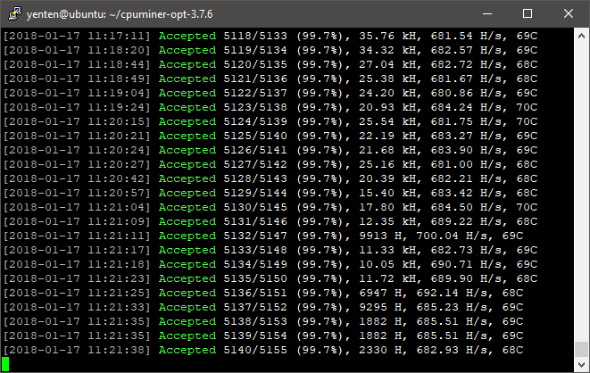 Все четыре гусеницы быстро начинают работать. Максимальный хешрейт, который я видел, составляет 7,89 кГц / с , но имейте в виду, что ядра процессора работают на частоте 816 МГц прямо сейчас (установлено armbian).Я считаю, что вы можете попробовать изменить частоту и получить более высокий хешрейт. И все же богаче от этого не станет 🙂